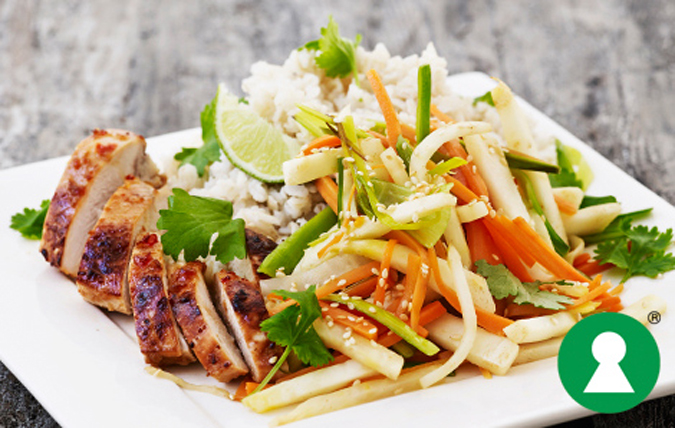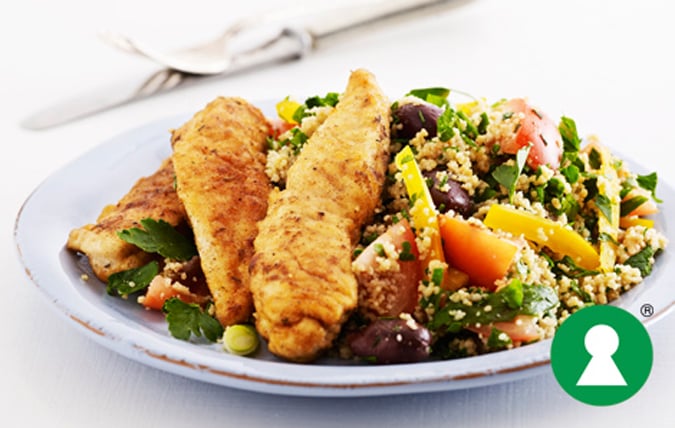 Många smaker samsas i den här djupgröna salladen, och alla bidrar de med sitt. Varsågod, en tabbouleh-inspirerad bulgursallad, serverad med sprödbakad kycklingfilé.