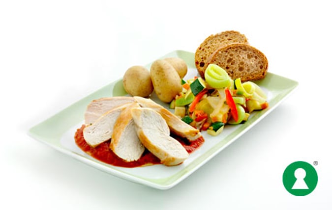 • Blanda kikärtsmjöl, paprikakrydda, ½ tsk salt, vitlökspulver och chilipulver i en djup tallrik. Vänd kycklingfiléerna i blandningen. Stek dem på båda sidorna i olja i en medelvarm släpp-lätt-panna, ca 10 minuter totalt, till dess de är genomstekta.
